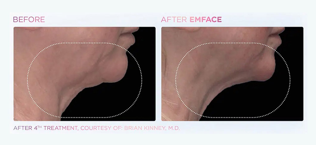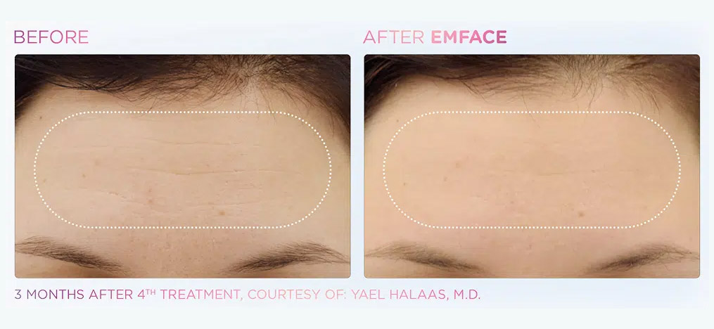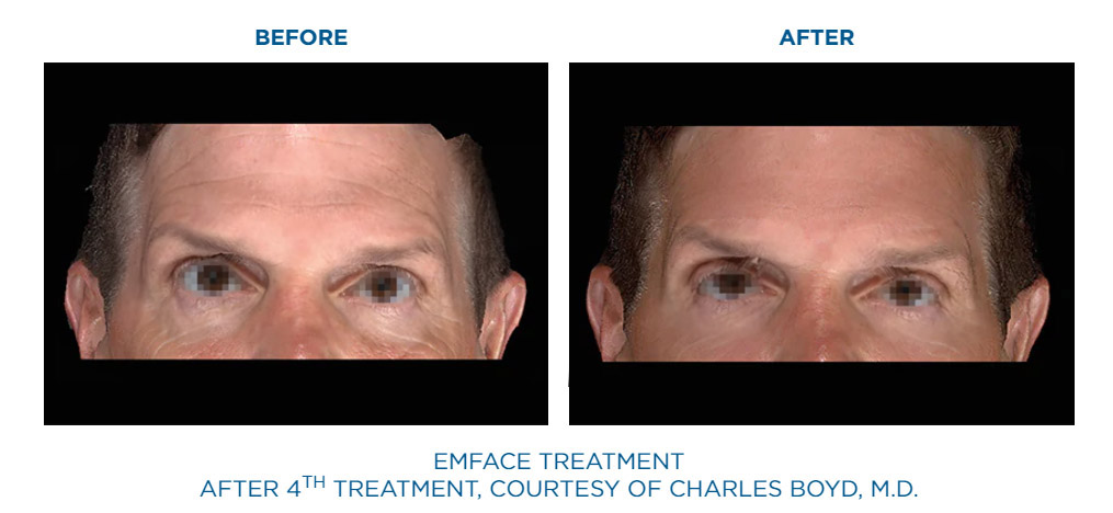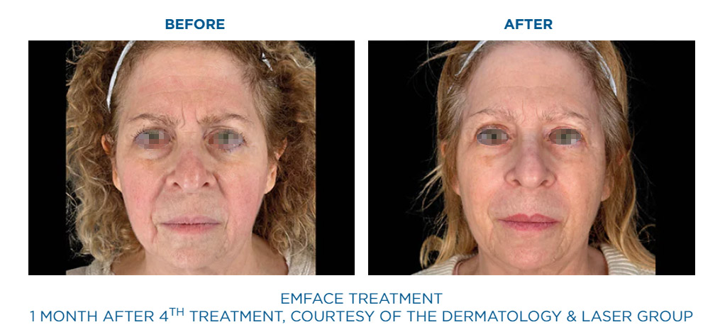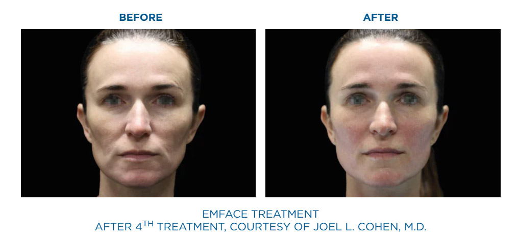 EmFace is the first procedure to apply patented combination of Synchronized Radiofrequency and the HIFESTM facial muscle stimulation. Synchronized RF heats the dermis to stimulate collagen and elastin production, while HIFESTM selectively contracts facial muscles.